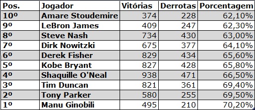 Muita gente pode falar que o jogo do San Antonio Spurs é chato, burocrático e impossível de assistir. Em partes eu até concordo. O que é inegável, no entanto, é que esse time sabe vencer como poucos na história da NBA. Para comprovar isso, encontramos um estudo bem legal sobre os jogadores com a maior porcentagem de vitórias em suas carreiras. Só deu Spurs no pódio! Veja abaixo a lista completa:
