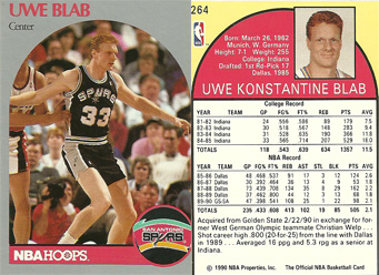 Assim como Brickowski, o ala-pivô também era um reserva do garrafão do Spurs. Mas sua importância do elenco texano era menor – ele chegou em atuar em 72 jogos da equipe durante a temporada 1989/1990, mas em apenas dois como titular. Na regular, suas médias foram de 2,4 pontos (46,5% FG, 20% 3 PT, 70,4% FT) e 3,2 rebotes em 12,3 minutos por jogo. Disputou nove dos dez jogos do time nos playoffs, apresentando médias de 0,9 pontos e 1,4 rebotes em 7,3 minutos por partida. O card é da coleção NBA Hoops.