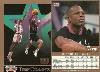 Companheiro de David Robinson no garrafão, o ala-pivô foi, talvez, o segundo jogador mais importante daquela campanha. Prova disso são seus números: Cummings disputou 81 jogos na temporada – 78 como titular – e anotou, em média, 22,4 pontos (47,5% FG, 32,2% 3 PT, 78% FT), 8,4 rebotes, 2,7 assistências e 1,4 roubadas de bola em 34,8 minutos por exibição. Nos playoffs, se tornou ainda mais importante e, após jogar as dez partidas da equipe, apresentou médias de 24,9 pontos (52,8% FG, 20% 3 PT, 80,8% FT), 9,4 rebotes e 2,2 assistências em 37,5 minutos por jogo. A carta acima é da coleção Sky Box.