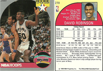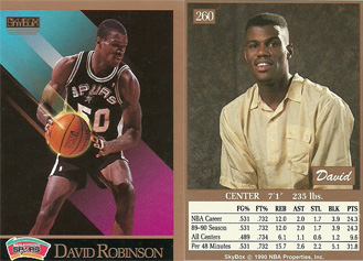 Não é preciso dizer que o pivô causou impacto imediato no Spurs. O Almirante, que até hoje é um dos maiores ídolos da franquia, disputou todos os 82 jogos de sua primeira temporada na NBA – 81 deles como titular – e terminou-a com médias de 24,3 pontos (53,1% FG, 73,2% FT), 12 rebotes, 3,9 tocos, duas assistências e 1,7 roubadas de bola em 36,6 minutos por exibição. Não à toa, foi eleito o novato do ano, e ainda participou do All-Star Game daquela temporada, deixando a quadra com expressivos 15 pontos (58,3% FG, 50% FT) e dez rebotes em 25 minutos. Nos playoffs, seus números foram quase iguais aos da regular: em dez jogos, apresentou médias de 24,3 pontos (53,3% FG, 67,7% FT), 12 rebotes e 2,3 assistências em 37,5 minutos por jogo. Acima, você pôde ver dois cards de Robinson, das coleções Sky Box e NBA Hoops.