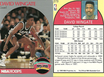 O jogador era reserva para as posições 2 e 3 do time texano. Wingate atuou em 78 partidas da equipe na temporada 1989/1990 – duas como titular – e apresentou médias de 6,8 pontos (44,8% FG, 77,7% FT), 2,7 assistências, 2,5 rebotes e 1,1 roubada de bola em 23,8 minutos por exibição. Nos playoffs, Wingate entrou em quadra em todas as dez partidas da equipe, e apresentou uma melhora em sua produção: anotou, em média, 9,1 pontos (51,9% FG, 66,7% 3 PT, 75% FT), 3,8 assistências e 3,7 rebotes em 29,3 minutos por exibição. Sua carta é da coleção NBA Hoops.