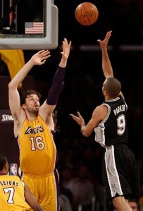Como eu disse acima, Splitter executou um bom trabalho, mas foi presa fácil para o camisa 17 – que marcou boa parte dos seus 21 pontos em cima do pivô brasileiro. Popovich notou essa dificuldade bem cedo (talvez por isso Splitter tenha jogado apenas 18 minutos na partida desta terça) e fez uma tentativa que deu muito certo: colocou Tim Duncan sobre Andrew Bynum e Boris Diaw na cola de Pau Gasol. No duelo europeu, o francês praticamente anulou o espanhol – tanto que Diaw retornou para o segundo tempo no quinteto titular do Spurs. Timmy, por sua vez, foi impecável defendendo o gigante do Lakers.