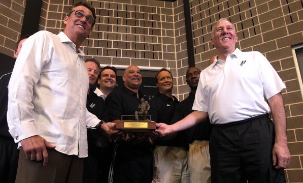 “Ser apontado entre tantos treinadores fantásticos é uma experiência sem igual”, declarou o Coach Pop, que dedicou o troféu aos seus assistentes e ao amigo e general manager R.C. Buford. “Meus assistentes e o R.C. Buford devem encarar esse prêmio como se fosse deles também”, afirmou.