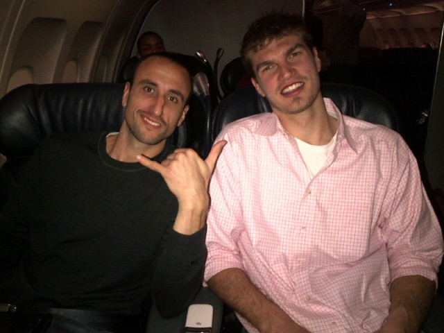 Nada como uma volta para casa tranquila após a varrida. Foto do argentino Manu Ginobili e do brasileiro Tiago Splitter no voo de volta para San Antonio. Obrigado ao leitor Edson Chiarotti Filho, que publicou a foto na nossa página no Facebook.
