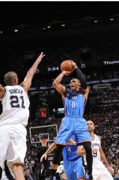 Tim Duncan, com 16 pontos e 11 rebotes, e Gary Neal – que enfim foi aproveitado como ala-armador, sua posição de origem -, com 12 pontos, também brilharam no ataque. Na defesa, o show foi de Stephen Jackson, que ajudou a limitar Kevin Durant. O ala do Thunder foi o principal pontuador do jogo, com 27 tentos, mas acertou somente 8 dos 19 arremessos de quadra que tentou.