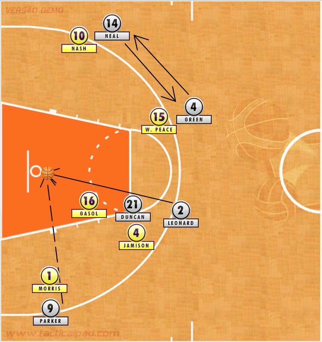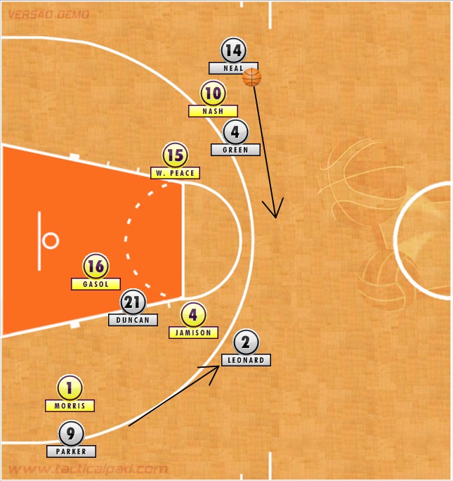 Na sequência, Duncan estabelece um corta-luz para que Leonard tenha caminho aberto em direção à cesta. O ala então faz o corte sem a bola e recebe o passe de ponte aérea de Parker. Enquanto isso, Neal e Green, os dois principais arremessadores de longa distância do Spurs, trocam de posição no perímetro para chamar a atenção da defesa.