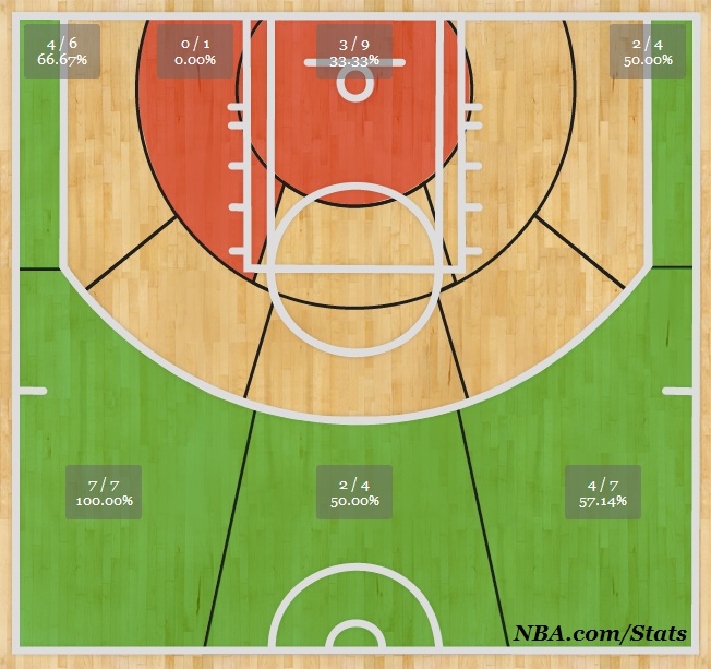 Nos 14 jogos que fez nos playoffs na temporada passada, Green converteu um total de 20 bolas de três pontos. Neste ano, só nos quatro jogos contra o Heat pela série decisiva, ele já acertou 19. É bom olhar para o gráfico de arremessos do ala-armador em uma final de NBA e ver, enfim, o verde como cor predominante no perímetro: