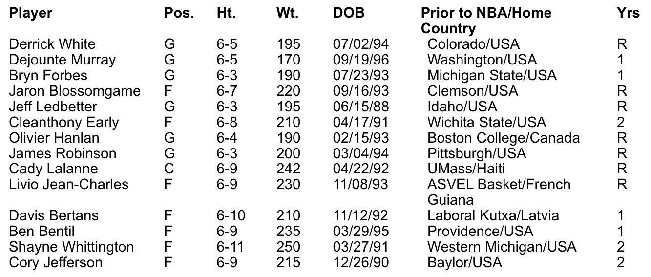 Entre os atletas que estiveram com o Spurs em 2016/2017, jogarão em Utah Dejounte Murray, Bryn Forbes, Davis Bertans e Livio-Jean Charles – o último foi dispensado antes da temporada começar. O quarteto será reforçado por dois jogadores provenientes do Draft deste ano: Derrick White, selecionado com a 28ª escolha, e Jaron Blossomgame, escolhido na 58ª posição.
