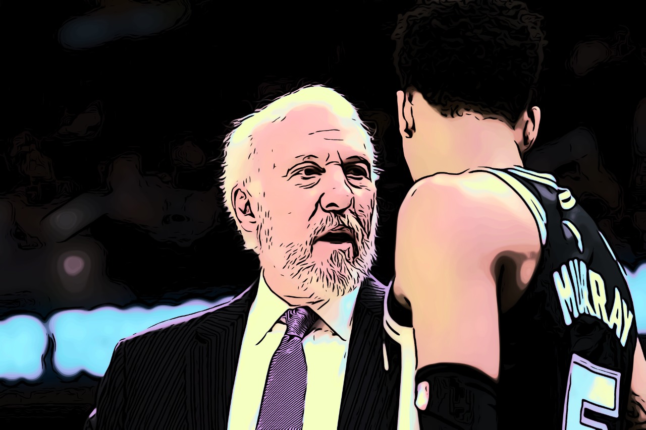 Arte do Cultura Pop sobre foto de Gregg Popovich e Dejounte Murray