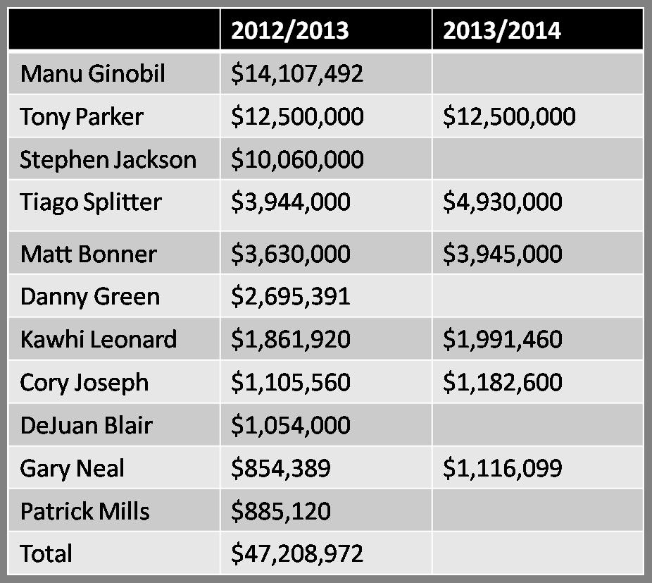 Abaixo, temos uma tabela com todos os jogadores sob contrato do Spurs e seus respectivos salários. Vale lembrar que Danny Green e Patrick Mills são agente livres restritos, ou seja, o Spurs pode cobrir qualquer proposta feita por eles, e a lista não conta com Boris Diaw e Tim Duncan – ambos agentes livres irrestritos e incertezas para a próxima temporada, embora Duncan já esteja com sua renovação contratual bem encaminhada.