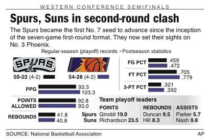 O San Antonio Spurs lutou, mas não conseguiu evitar a derrota para o Phoenix Suns, sendo “varrido” pela equipe do Arizona, que venceu a série por 4 a 0 e avançou para as finais da conferência. Steve Nash, Amare Stoudemire e Jared Dudley comandaram o Phoenix na última partida do Spurs na temporada.