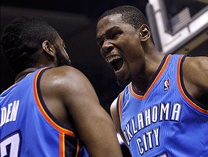 Mesmo com a derrota do Spurs, temos de convir que esta série está um espetáculo a parte, com um basquete jogado em alto nível e personagens que abrilhantam o show com suas apresentações. Quando a vantagem do Thunder passava dois dígitos, apareceu toda a genialidade de Manu Ginobili, com cestas de três pontos espíritas e infiltradas impossíveis. Mas, para o nosso azar, a equipe adversária também tem gênios.Um destes é Kevin Durant. Modesto nos três primeiros quartos o ala, chamou a responsabilidade nos momentos finais, adicionando nove pontos no último período.